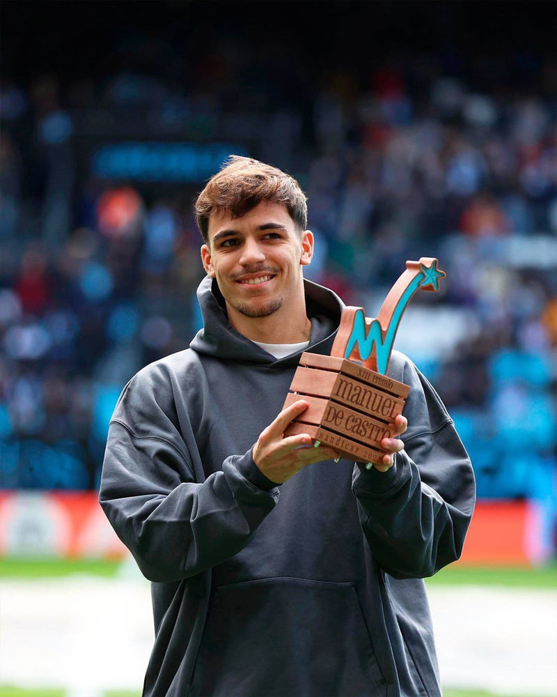 El canterano, ahora fuera de las fronteras celestes, recibió el pasado domingo el premio Manuel de Castro en la previa del encuentro ante el Rayo Vallecano. Es el primer jugador que lo hace sin estar un año completo