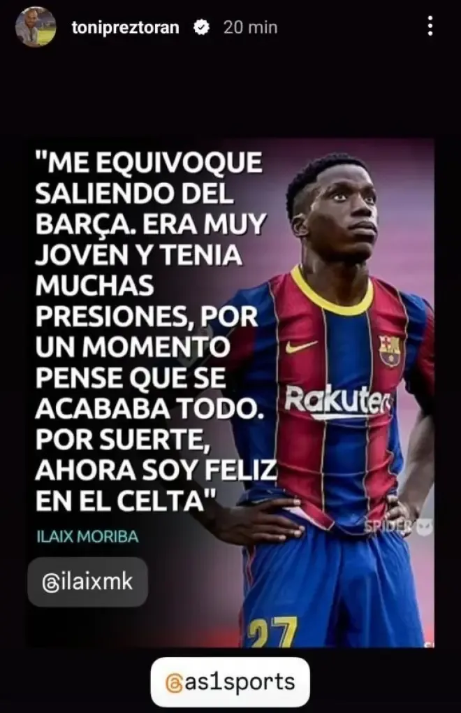 Y el propio Ilaix, echando la vista atrás, ahora reconoce que su salida del Barça para fichar por el Leipzig fue una equivocación. "Me equivoqué saliendo del Barça. Era muy joven y tenía muchas presiones", dice el futbolista en unas declaraciones recogidas por su agencia de representación AS1Sports en Instagram.