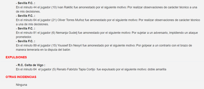 De hecho, aunque se sospechaba alguna amonestación más en el abrupto cierre del choque, no aparece nada sobre las protestas que le dirigieron varios miembros del banquillo celeste, con su técnico a la cabeza. La doble amarilla a Renato Tapia y su correspondiente expulsión en el minuto 65, indiscutible a ojos de todos, y las cinco a jugadores nervionenses es lo único que se refleja en el documento oficial que firma el lanzaroteño. Ninguna mención a incidentes de público o de los entrenadores. Otra cosa será la valoración de las palabras ante los medios de comunicación de los dos portavoces del vestuario, si bien es cierto que ya se han pronunciado de manera similar antes este mismo curso sin sanción.