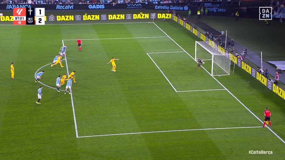 Sin embargo, aunque el penalti no deja lugar a dudas, si que hubo polémica con la repetición del lanzamiento, no porque Vicente Guaita no estuviera adelantado en la pena máxima que acierta a detener, sino porque en la segunda, en la que sí acaba en gol, cuando Lewandowski dispara ya hay un jugador azulgrana dentro del área, motivo por el que debió volverse a repetir el lanzamiento de penalti, o no...