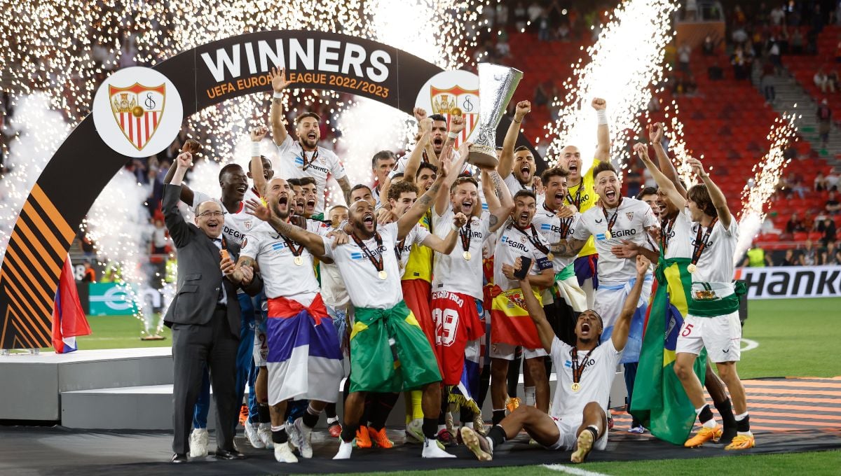 El Sevilla, con el trofeo de campeón de la Europa League.SFC