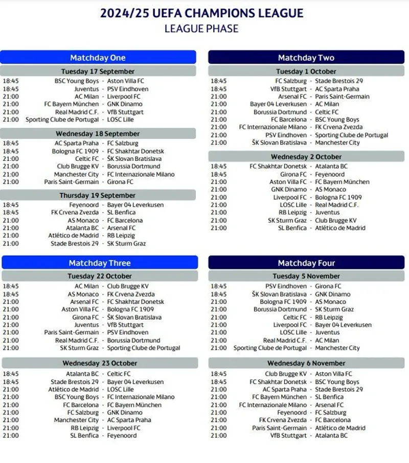 Entre ellos, están los tres ‘grandes’ de nuestro fútbol, el Real Madrid, el FC Barcelona y el Atlético de Madrid, que aspiran a dar un notable paso hacia delante en el Viejo Continente. Poco a poco, se van conociendo más detalles acerca de la primera ronda de este campeonato, uno de los más prestigiosos del mundo. Uno de los más importantes, las fechas y horarios de todos los encuentros que forman parte de la ‘fase liga’.