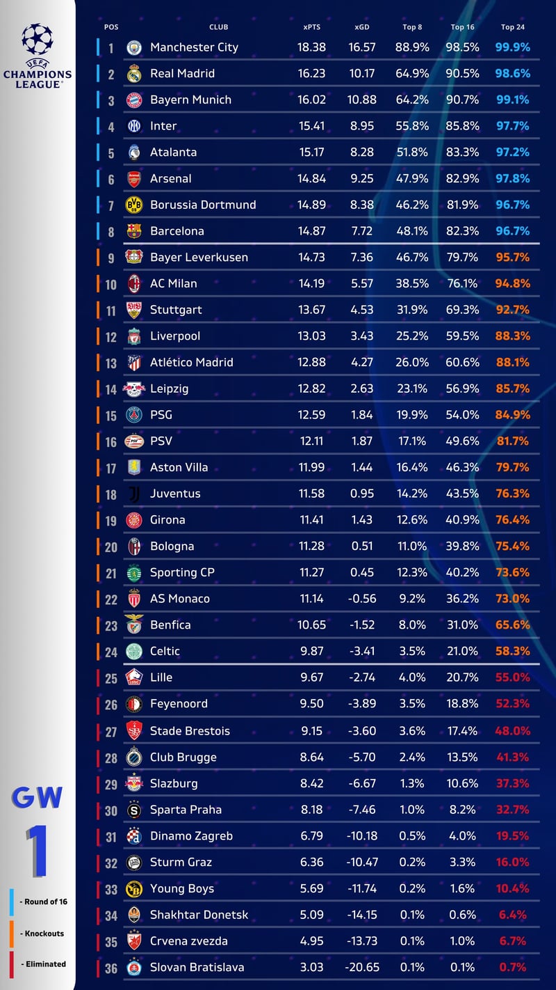 El resto de posiciones hasta completar el elenco de ocho serían para: Bayern Múnich (16.02 puntos y 64.2% top 8); Inter de Milán (15.41 puntos y 51.8% top 8); Atalanta (15.17 puntos y 51.8% top 8); Arsenal (14.84 puntos y 47.9% top 8); Borussia Dortmund (14.89 puntos y 46.2% top 8) y FC Barcelona (14.87 puntos y 48.1% top 8).