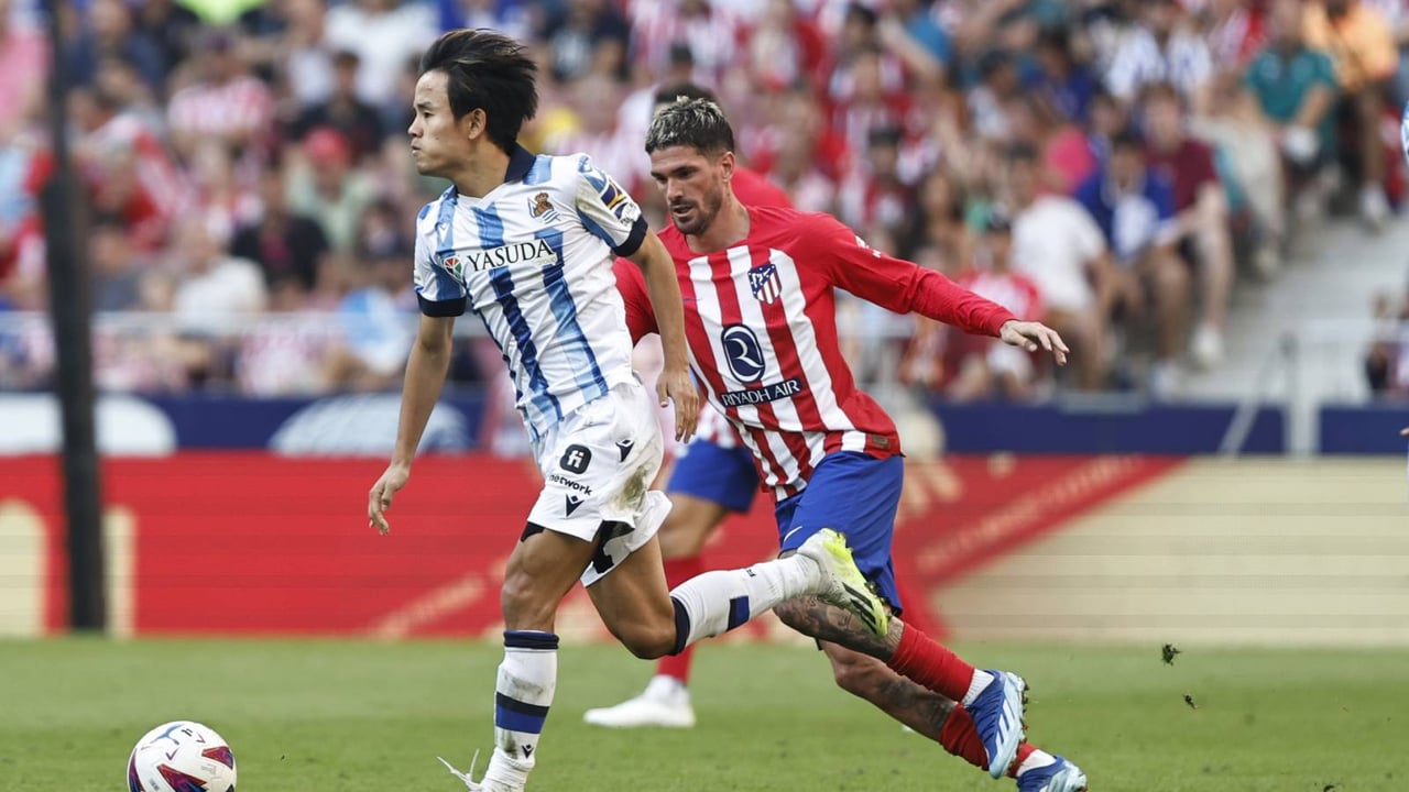 Take Kubo conduce el balón ante la atenta mirada del atlético De Paul.UES