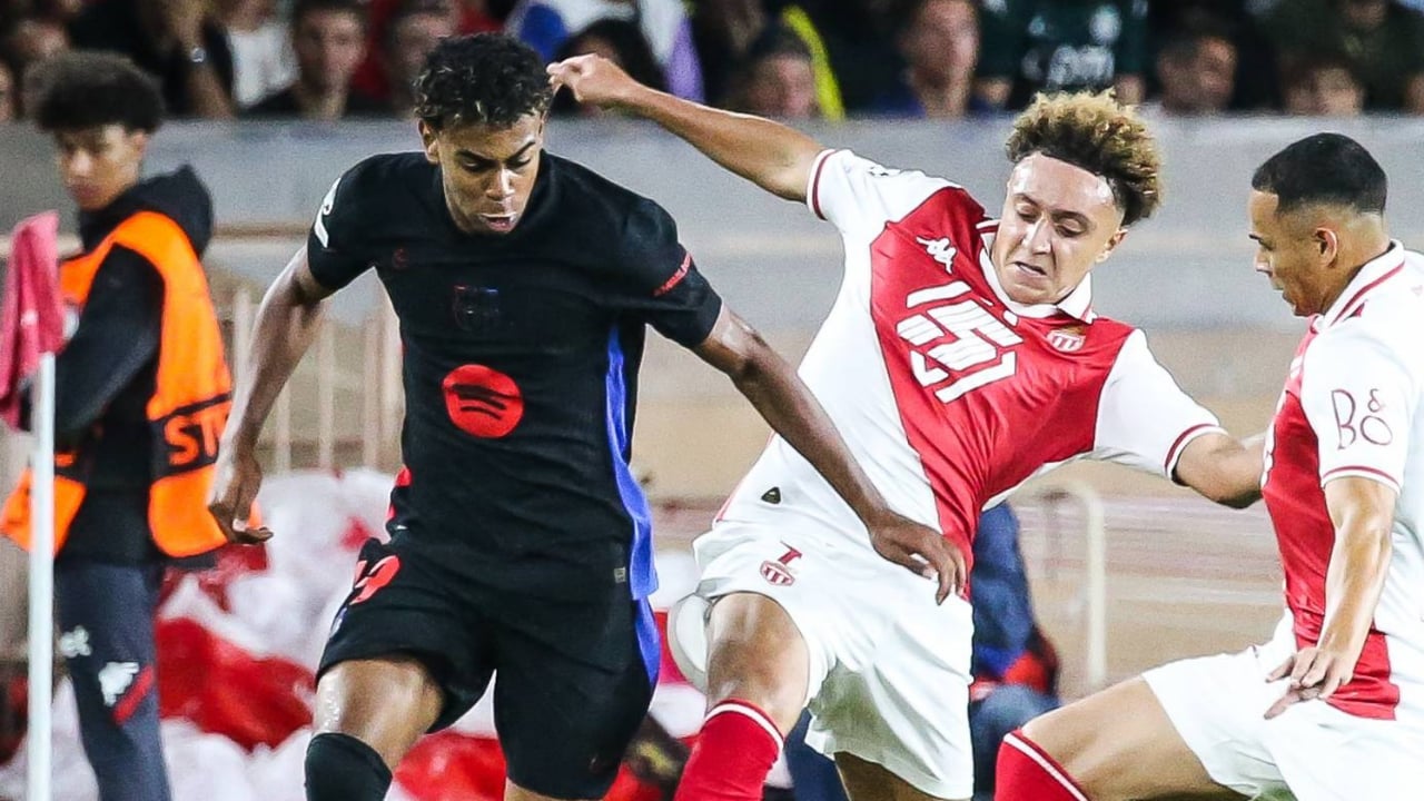 Lamine Yamal, intentando deshacerse de los defensores del MónacoCORDON PRESS