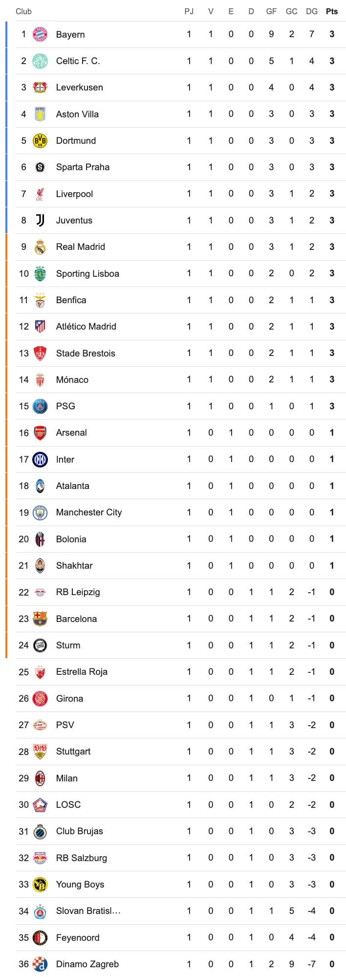 La impresionante goleada del Bayern Múnich por 9-2 ante el Dinamo de Zagreb le coloca como el primer líder de la nueva Liga de Campeones, en la cual ya no hay grupos, sino una liga en la que quedan clasificados todos los participantes. Junto a los alemanes hay otros 14 equipos que han logrado la victoria, incluyendo dos españoles como Real Madrid y Atlético.