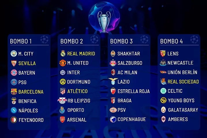 - Bombo 4: Real Sociedad, Galatasaray, Celtic, Lens, Newcastle, Unión Berlín, Amberes y Young Boys.