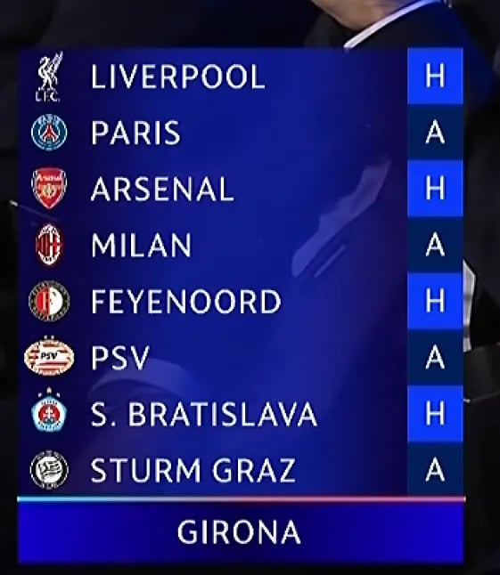 Le toca al histórico Girona, que tendrá que jugar contra Liverpool, PSG, Arsenal, Milan, Feyenoord, PSV, S. Bratislava y Sturm Graz.