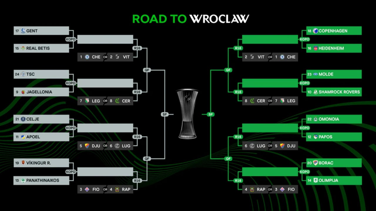 Los ocho primeros clasificados de la fase liga (Chelsea, Vitória de Guimaraes, Fiorentina, Rapid de Viena, Djurgarden, Lugano, Legia de Varsovia y Círculo de Brujas) serán los cabezas de serie en octavos, por lo que disputarán la vuelta en casa, con cruces predefinidos (sólo dos alternativas) según también cómo quedaran los que pasaron a dieciseisavos (del 9º al 24º). Así, londinenses y lusos se emparejarán con el Betis o el Copenhague (por ejemplo, si los heliopolitanos evitaran a los ingleses ahora, éstos irían por el otro lado del cuadro, por lo que sólo se los encontrarían en una hipotética final); los italianos y los austríacos, con el Panathinaikos griego o el Borac Banja Luka bosnio; los suecos y los suizos, con el Paphos chipriota o el Celje esloveno; y los polacos y los belgas, con el Jagiellonia (único derbi nacional posible) o el Molde noruego.