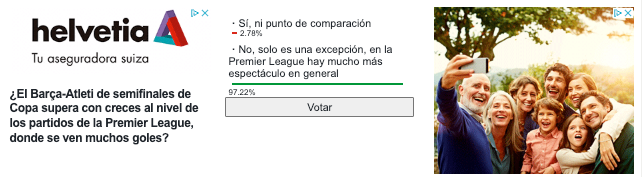 Pues eso es más o menos lo que se vio en el día de ayer en Montjuïc, un espectáculo de goles del que todo el mundo habla. Por ello, hemos querido saber a través de la Encuesta Helvetia en ESTADIO Deportivo la opinión del espectador, sobre si de verdad estas semifinales de Copa del Rey se asemejan más bien al estilo de la Premier o más bien fue un espejismo.