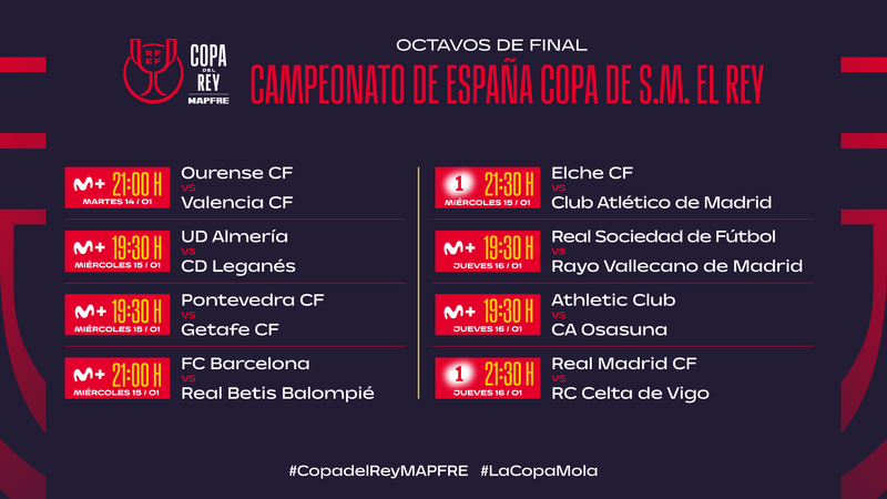 Más tarde, a las 21:30 horas, será el turno del Elche CF-Atlético de Madrid, también por el primer canal de la televisión pública de carácter nacional. A las siete y media de la tarde del próximo miércoles se jugarán el UD Almería-CD Leganés y el Pontevedra CF-Getafe CF, los dos por Movistar Plus y seguramente las menos interesantes a priori entre las eliminatorias que darán paso a los cuartos de final (los días 4, 5 y 6 de febrero), última fase ya a partido único, puesto que las semifinales, que arrancarán el 26-F, serán a ida y vuelta, con resolución el 2 de abril para que la gran final, de nuevo en el sevillano Estadio de La Cartuja, se dispute el 26-A.