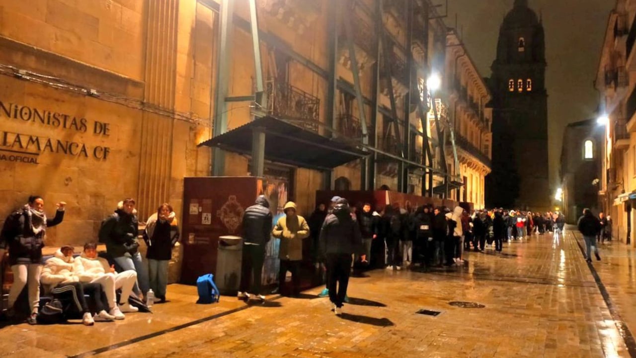 Imagen de la cola que había esta madrugada en la tienda oficial de Unionistas de Salamanca.X / Unionistas