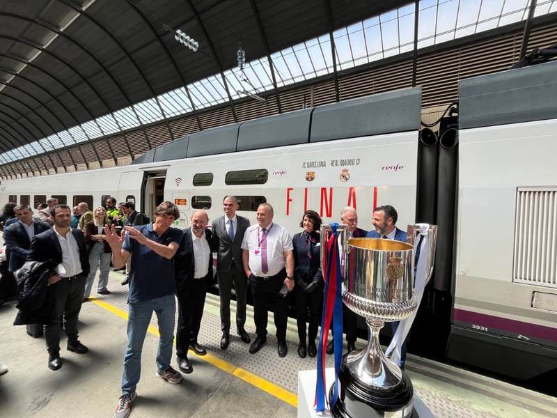La Copa del Rey llegó este miércoles a Sevilla. El trofeo llegó a Santa Justa pasadas las 15:30h de la tarde mediante un AVE del que la descendieron dos verdaderas leyendas del fútbol español. Fueron Julio Salinas, como representante del FC Barcelona, y Pepe, como exfutbolista del Real Madrid quienes aparcaron la rivalidad que mantienen viva en sus corazones para bajar codo con codo el trofeo que estará en juego el próximo sábado día 26 de abril en el Estadio de La Cartuja. Sendos futbolistas estuvieron cobijados por una expedición encabezada por la presencia de Rafael Louzán, el presidente de la RFEF.