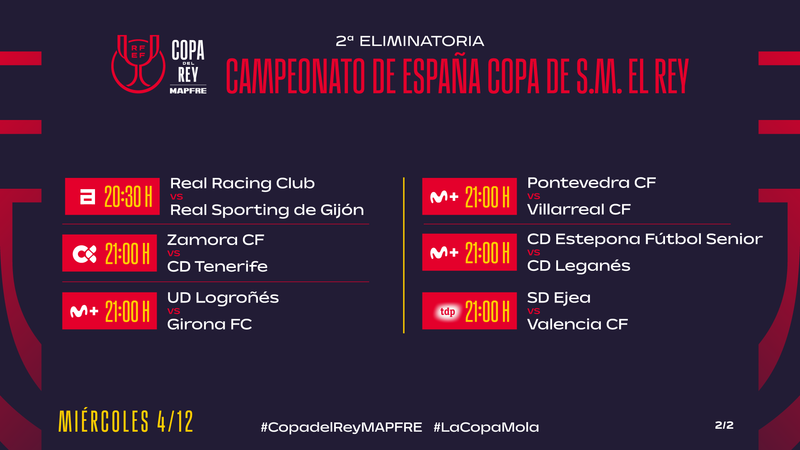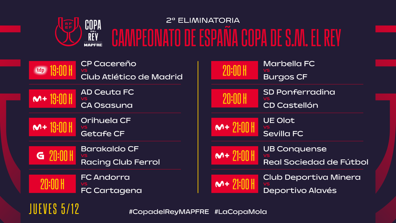 Ya el jueves 5 de diciembre, los otros diez emparejamientos: tres a las 19:00 horas (CP Cacereño-Atlético de Madrid, en abierto por TDP; y AD Ceuta-CA Osasuna y Orihuela CF-Getafe CF, por M+), cuatro a las 20:00 horas (Barakaldo CF-Racing de Ferrol, por la TV Galega, más FC Andorra-FC Cartagena, Marbella FC-Burgos CF y SD Ponferradina-CD Castellón, sin canal asignado) y otros tres a las 21:00 horas, todos por los diales reservados por Movistar Plus para el torneo del K.O. (UE Olot-Sevilla FC, UB Conquense-Real Sociedad y CD Minera-Deportivo Alavés).