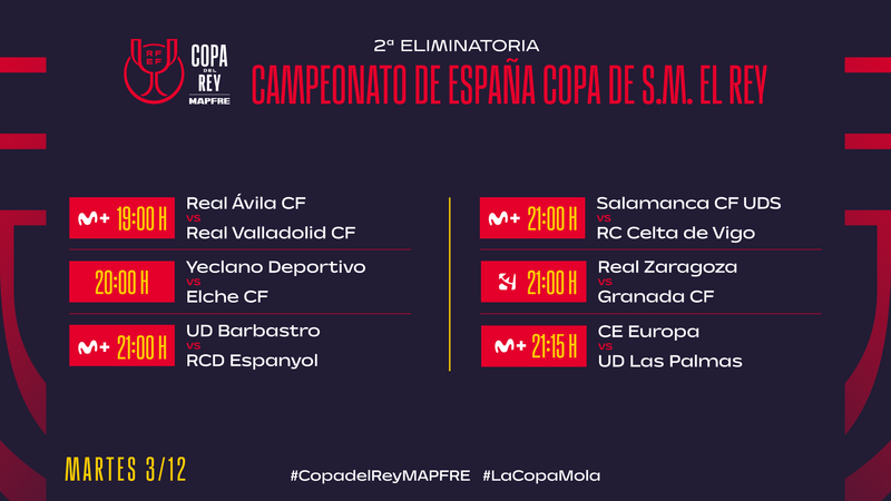 El martes 3 de diciembre solamente se celebrarán cinco encuentros (son eliminatorias a partido único todavía): el Real Ávila-Real Valladolid (19:00 horas, televisado por Movistar Plus), el Yeclano Deportivo-Elche CF (20:00 h), tres a las nueve de la noche (UD Barbastro-RCD Espanyol y Salamanca CF-RC Celta de Vigo, ambas por la plataforma de Telefónica, y Real Zaragoza-Granada CF, por Aragón TV) y el CE Europa-UD Las Palmas (21:15 horas, M+). El grueso se disputará el miércoles 4 de diciembre, con presencia cantada del conjunto de Manuel Pellegrini, que llegará a tierras catalanas tras visitar este domingo 1-D a la Real Sociedad en LaLiga y antes de comparecer el sábado 7-D en el Benito Villamarín ante el FC Barcelona. Así, el Sant Andreu-Real Betis se jugará a las 19:00 h, mismo horario y canal (Movistar Plus) que el Unionistas de Salamanca-Rayo Vallecano, como también el Gimnàstic de Tarragona-SD Huesca (por Aragón TV).