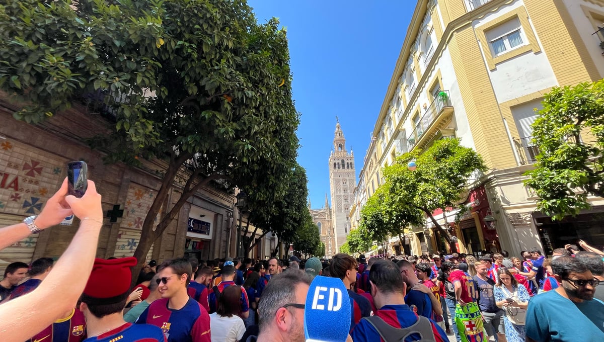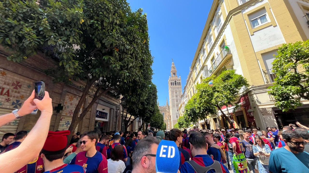 Siguen llegando aficionados del FC Barcelona, que parecen más numerosos que los del Real Madrid, a la ciudad de Sevilla para presenciar la final de la Copa del Rey 2025.