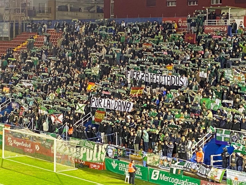 Se guardó un minuto de silencio en memoria de las víctimas de la DANA en el Mediterráneo. Los hinchas béticos, con un cartel de apoyo.