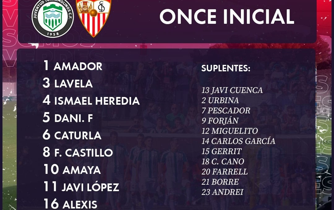 ? 20:10 El once del Juventud de Torremolinos: Amador Zarco; Miguel García, Ismael Heredia, Dani Fernández, Lavela; Castillo, Caturla; Javi López, Amaya, Chamorro; y Machuca.