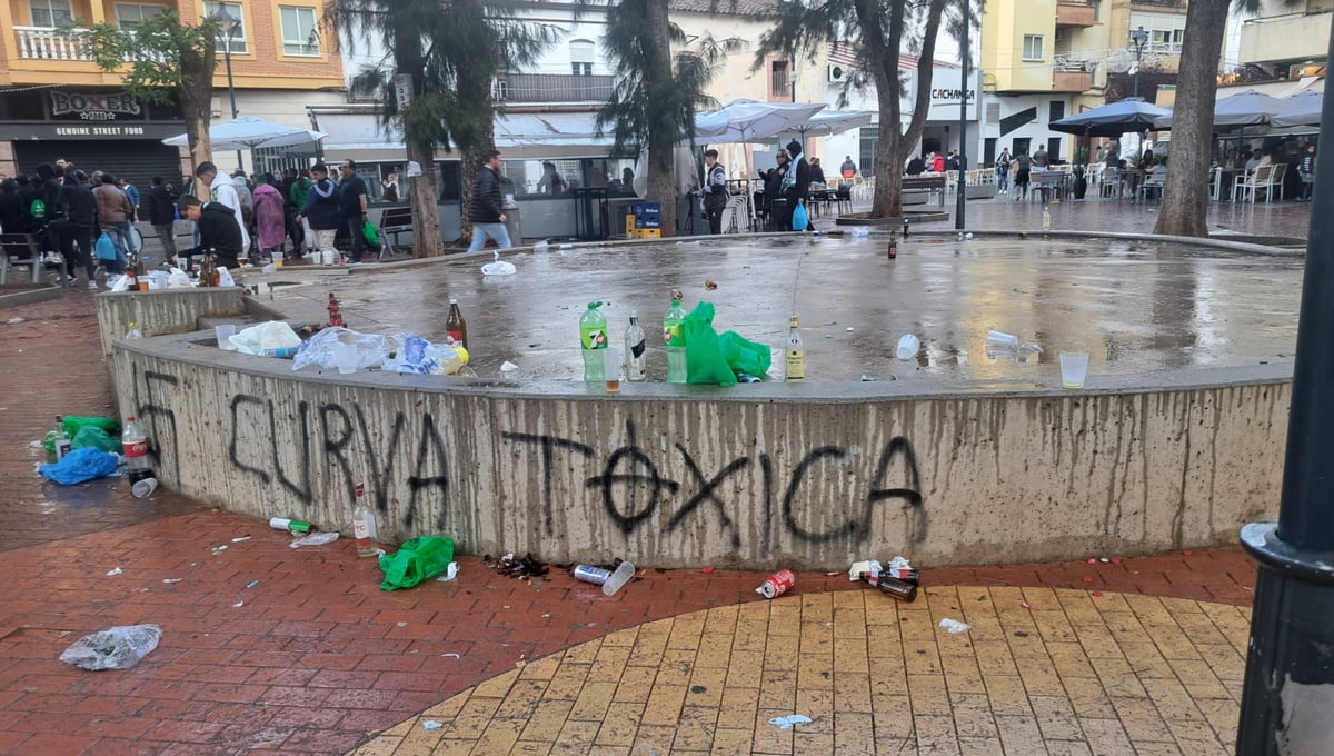 Las secuelas en el mobiliario urbano de la Plaza Extremadura que dejaron a su paso los aficionados en la 'fanzone' bética.@elforomdm
