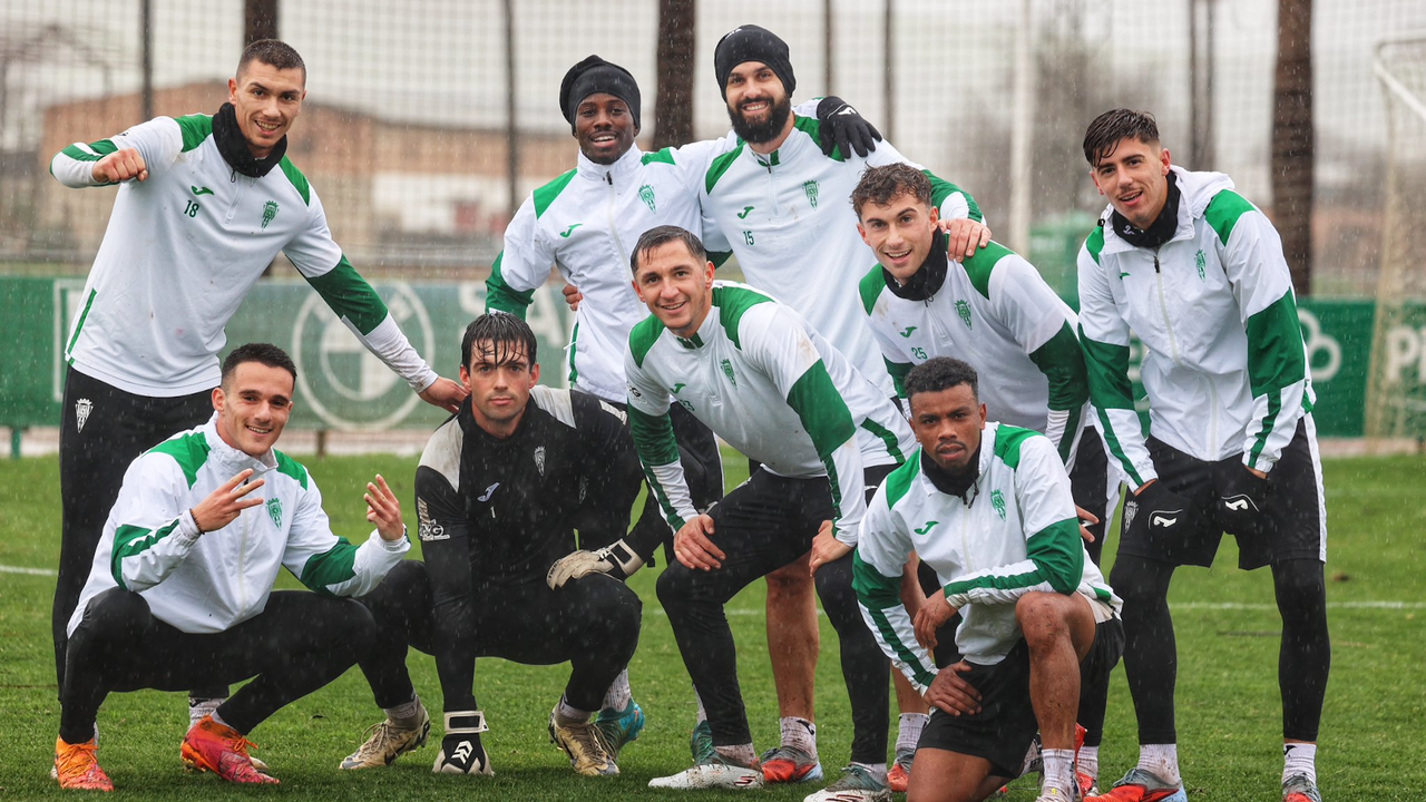 Algunos jugadores del Córdoba en un entrenamiento bajo la lluvia de esta semana@CordobaCF_ofi