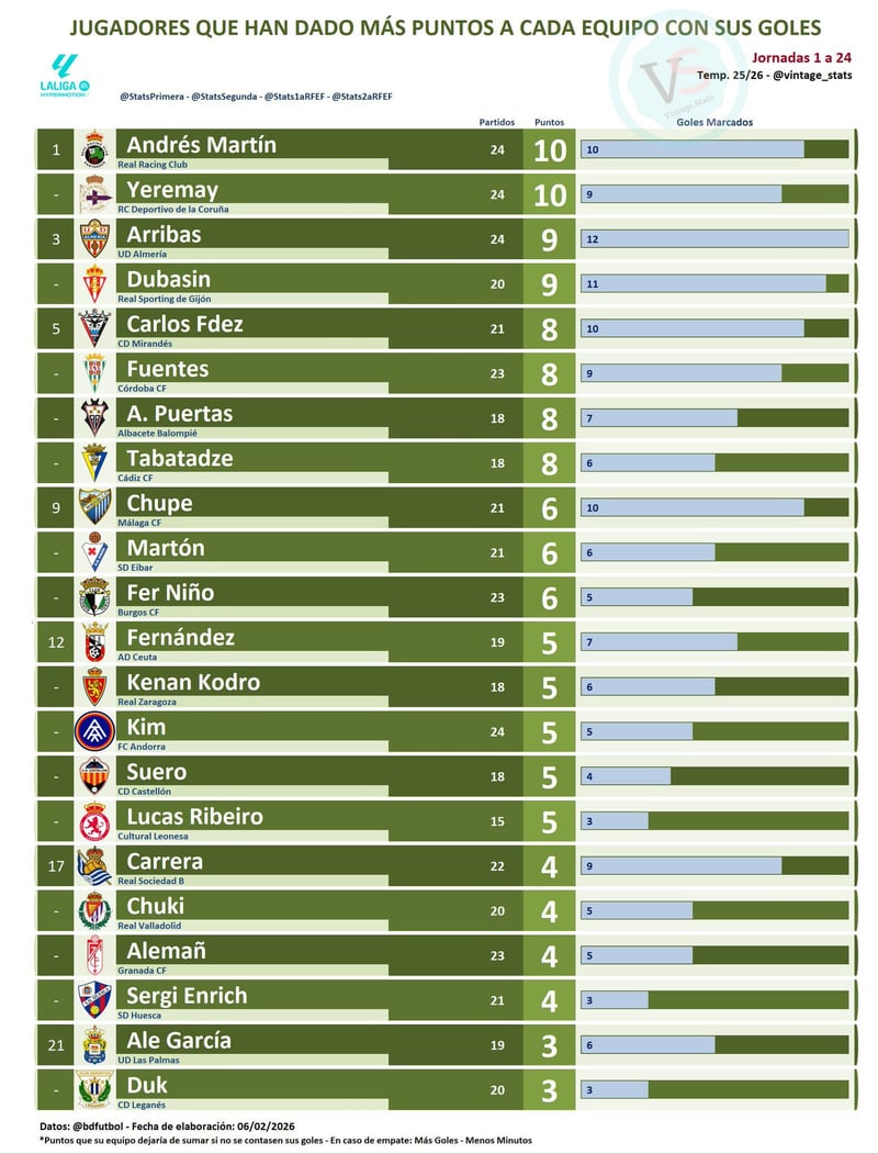 La influencia de Lucas RIbeiro en la Cultural Leonesa ha quedado demostrada con sus goles. Así, la cuenta de X (antes Twitter) 'Stats Segunda' publicó esta misma semana una tabla en la que se recogían los jugadores que más puntos le habían dado a su equipo con sus goles. En esta tabla aparecía en la posición número 12 el brasileño Lucas Ribeiro.