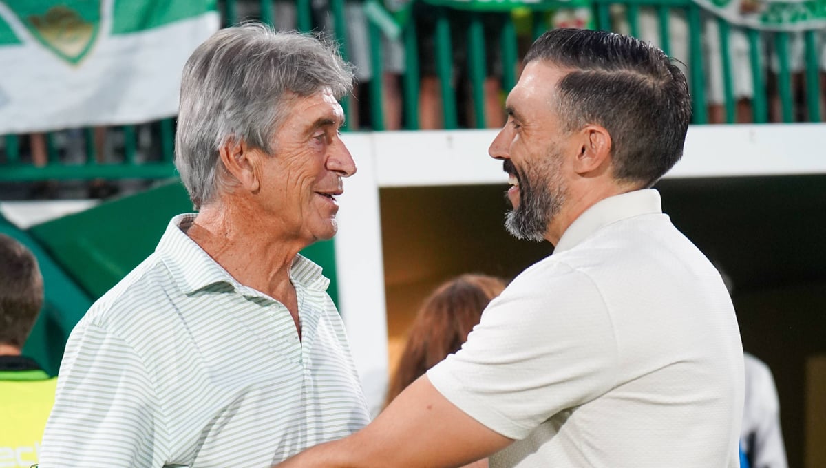 Eder Sarabia saluda a Manuel Pellegrini en la previa del Elche - Betis.Cordon Press