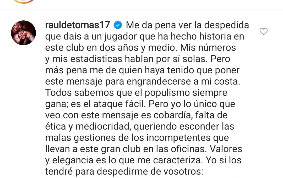 "Me da pena ver la despedida que dais a un jugador que ha hecho historia en este club en dos años y medio. Mis números y mis estadísticas hablan por sí solas. Pero más pena me de quien haya tenido que poner este mensaje para engrandecerse a mi costa.