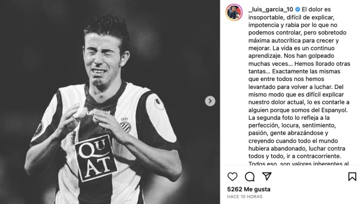 Este es el mensaje íntegro que ha publicado Luis en Instagram: "El dolor es insoportable, difícil de explicar, impotencia y rabia por lo que no podemos controlar, pero sobretodo máxima autocrítica para crecer y mejorar. La vida es un continuo aprendizaje. Nos han golpeado muchas veces… Hemos llorado otras tantas… Exactamente las mismas que entre todos nos hemos levantado para volver a luchar. Del mismo modo que es difícil explicar nuestro dolor actual, lo es contarle a alguien porque somos del Espanyol. La segunda foto lo refleja a la perfección, locura, sentimiento, pasión, gente abrazándose y creyendo cuando todo el mundo hubiera abandonado, luchar contra todos y todo, ir a contracorriente. Todos eso, son valores inherentes al RCDE y a partir de lo que debemos crecer. Solo podemos agradeceros eternamente vuestro apoyo incondicional, estamos en deuda con todos vosotros. Nada ni nadie podrá con 123 años de historia de un sentimiento único.Volveremos !!! 💪🏻💪🏻Visca l’Espanyol !! 🤍💙 #rcde @rcdespanyol".