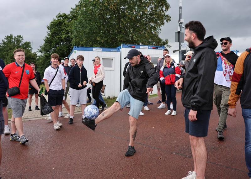 Así se lo pasan los aficionados ingleses que se han desplazado a las inmediaciones del estadio en el que en poco más de quince minutos debutará su país en la Eurocopa de Alemania 2024. La ilusión es máxima y las ganas de revancha, impresionantes. Tras la decepción en los penaltis ante Italia en la pasada edición, los británicos quieren alzarse con el primer título continental de toda su historia. ¡Vibra el Schalke Arena!