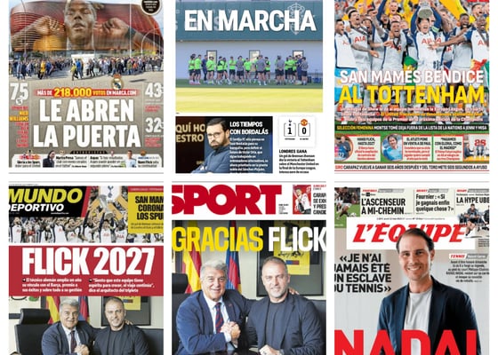 Las portadas deportivas del jueves 22La renovación de Flick, Nico Williams y el Madrid, el Tottenham se corona en la Europa League... así vienen las portadas