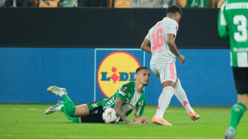 Final del primer tiempo, tras un minuto largo de prolongación. Gana el Betis por 2-0 gracias a los goles de Abde y Antony. De menos a más los verdiblancos, que encauzan su primer triunfo casero en esta edición de la Europa League.
