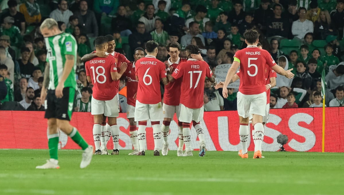 Con seis cambios de inicio, el 'Ingeniero' dibujó una primera parte en la que intentarían someter al 'gigante' inglés con intensidad y velocidad, asumiendo riesgos por la obligación de buscar la portería de De Gea. Y sus pupilos cumplieron, tirando de anticipación y empaque para no pasar demasiados apuros salvo a balón parado, cuando resurgieron los clásicos problemas de los verdiblancos para defender centros laterales, si bien el único disparo entre palos de los mancunianos, que se queda habitualmente fuera de esa recopilación estadística, llegaría en el alargue de esta fase. La cuelga Bruno Fernandes, despeja en corto un zaguero y Pellistri la empalma en semifallo para que la acometida de Weghorst confunda a Rui Silva, auxiliado a la postre por el palo.