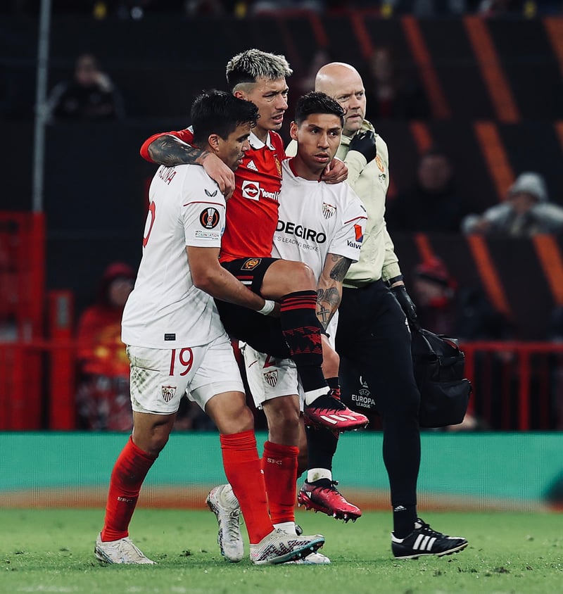 Grave lesión de Lisandro Martínez. Ya ha hecho los tres cambios Ten Hag, por lo que el United terminará con diez. Gran gesto de Rakitic al echarla fuera cuando escuchó el crujido al parecer del tobillo del argentino.