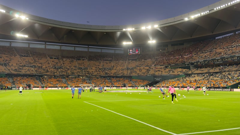 Como muestra la imagen a esta hora del querido compañero Alfredo de Anca de Lince Photo Agency, empiezan a llenarse las gradas de La Cartuja. Habrá unos 3.500 hinchas ingleses, pero mayoría verdiblanca, como siempre.
