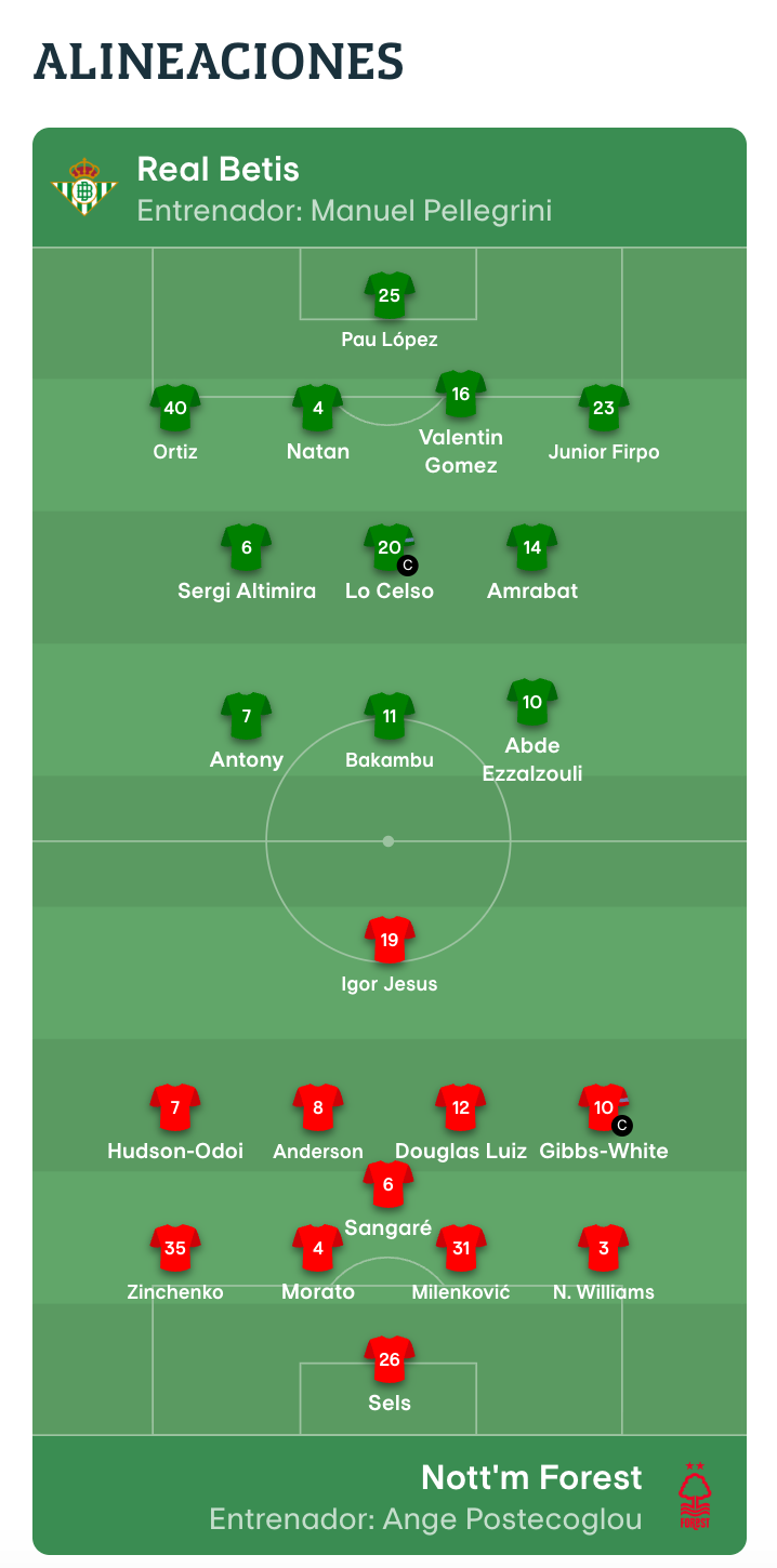 Mantiene Manuel Pellegrini bajo palos a Pau López, mientras que Ortiz suple en el lateral derecho a Bellerín y Junior Firpo se mantiene en el izquierdo. Por dentro, los dos centrales zurdos de la primera plantilla (a ver si se entienden mejor que en el arranque en el Ciudad de Valencia): Natan y Valentín Gómez. En el doble pivote, vuelve Altimira en lugar de Fornals, pero se mantiene Amrabat, con Lo Celso de enganche. El cuarto cambio es en punta, ya que Bakambu releva al Cucho Hernández. Porque Antony y Ez Abde volverán a ser los estiletes.