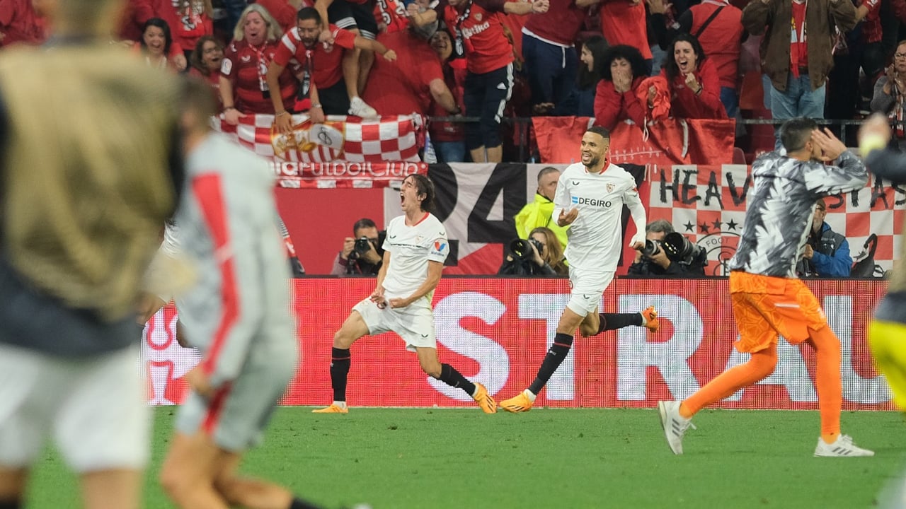 La euforia de Bryan Gil, asistente, y En-Nesyri tras el 2-1 de Lamela.Lince