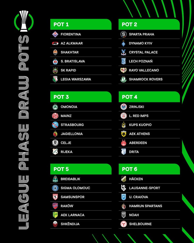 Bombo 6: Hacken (SUE), Lausana (SUI), U. Craiova (RUM), Hamrun Spartans (MAL), Noah (ARM), Shelbourne (IRL).