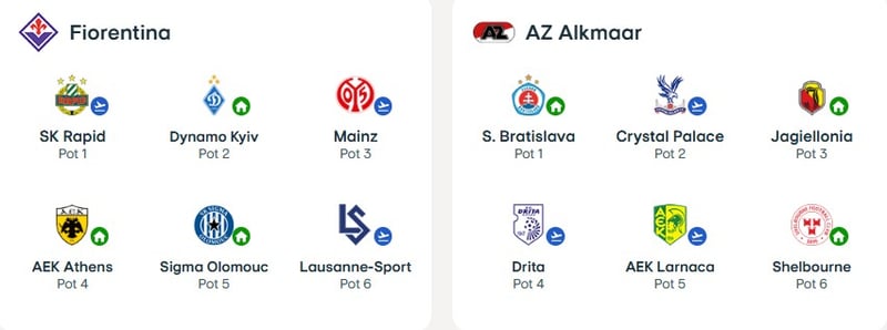 Bombo 1: Fiorentina (ITA), AZ Alkmaar (NED), Shakhtar (UCR), Slovan Bratislava (SVK), Rapid (AUT), Legia Varsovia (POL).