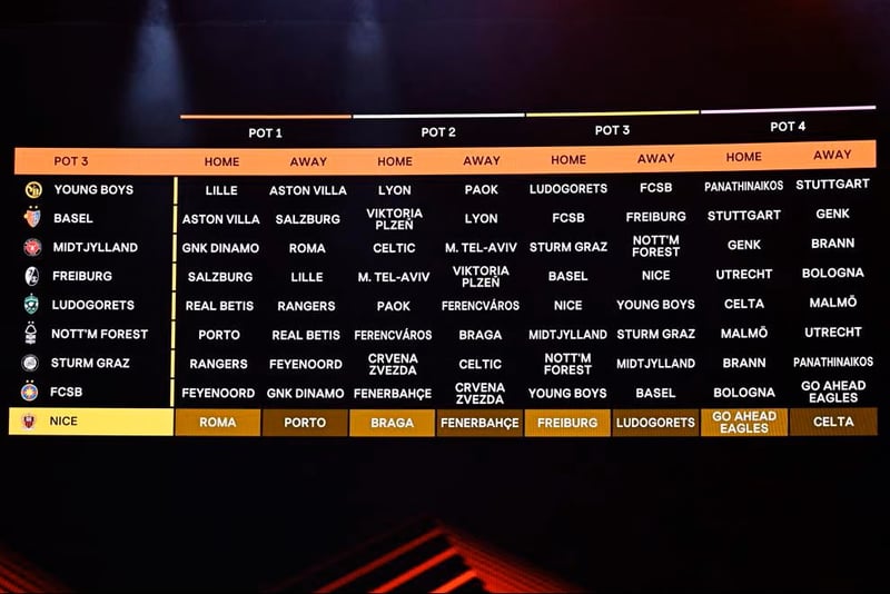 Bombo 3: Young Boys (SUI), Basilea (SUI), Midtjylland (DIN), Friburgo (ALE), Ludogorets (BUL), Nottingham Forest (ING), Sturm Graz (AUT), FCSB (RUM), Niza (FRA).