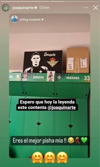 Por cierto que Joaquín podría devolver visita y gesto a Erling Haaland, el delantero del Manchester City al que conoció el pasado mes de junio en Marbella. Entonces, bromeó sobre que el noruego quería fichar por el Betis, "como todos", pero que no había sitio, una familiaridad que el ariete confirmó al dedicarle indirectamente la victoria y su partidazo (marcó dos de los cuatro goles de su equipo) en el Ramón Sánchez-Pizjuán ante el Sevilla FC. Al día siguiente, los mancunianos se ejercitaron en la Ciudad Deportiva Luis del Sol antes de volver a casa, dejando el nórdico un recado al gaditano en su taquilla de Los Bermejales. Todo quedó inmortalizado en las 'stories' de Instagram de ambos. Este viernes, por cierto, el '17' podría corresponder a su amigo, con el que no se encontró allá por el mes de septiembre al estar descansando antes del viaje con los heliopolitanos a Helsinki. Los celestes no compiten entre semana, aunque han cedido igualmente sus instalaciones para el entrenamiento del que fuera su entrenador antes de arribar a la capital hispalense para preparar la cita del domingo en Villarreal y no perder tiempo con viajes.