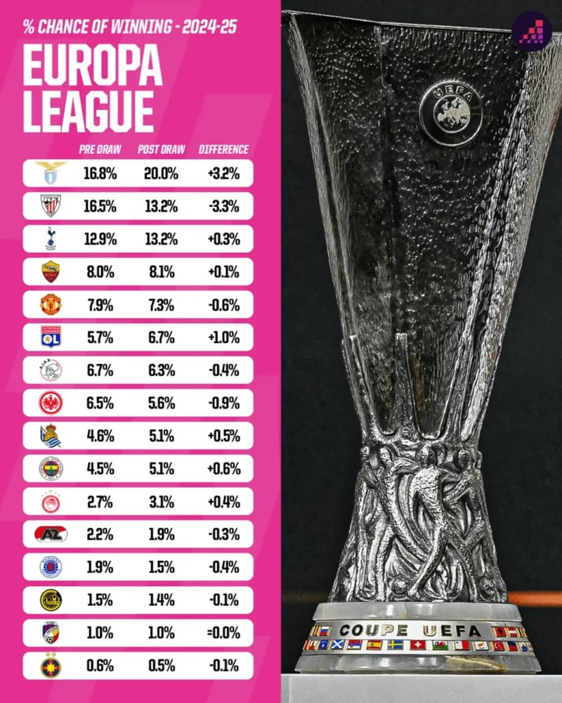 La Lazio, gran favorita a hacerse con el título, también ha aumentado sus opciones. Comenzará su fase de eliminatorias ante el Viktoria Plzen y en caso de pasar se cruzaría con el Bodo Glimt o el Olympiakos. Han aumentado un 3,2% después de que el cuadro le empareje por el lado fácil, donde su rival más difícil podría ser el Ajax o el Tottenham en una hipotética ronda de semifinales.