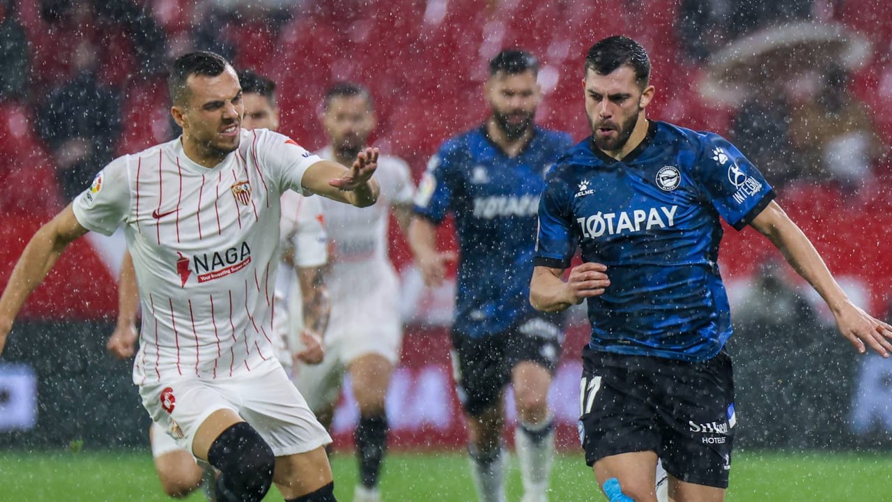 El sevillista Jordan trata de frenar a Luis Rioja, jugador del Alavés.Cordon Press
