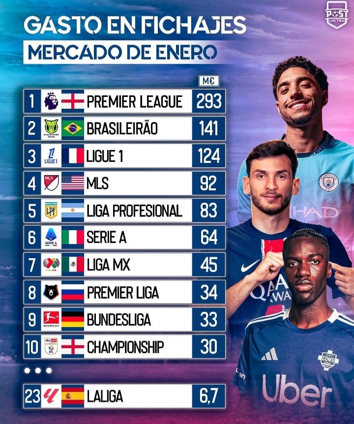 Así va el gasto en fichajes en las diferentes ligas del mundo. El mercado de fichajes en LaLiga EA Sports, tal y como se puede ver, no está siendo uno de los mas derrochadores en lo que a nivel internacional se refiere.