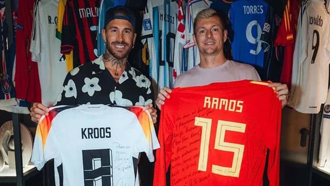 "Toda colección de leyendas estaría incompleta sin uno de los más grandes, mi hermano Kroos. Como jugador un diez, como persona un once. Gracias, hermano. ¡Siempre en mi equipo!", fue lo que escribió Ramos para acompañar las fotografías del encuentro, haciendo mención a la colección de camisetas que el camero tiene y que se ve en la imagen.