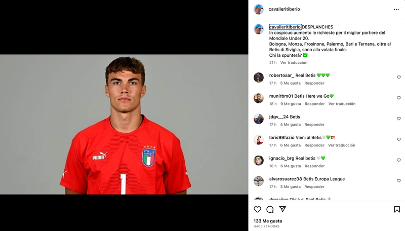 El representante de Desplanches, Tiberio Cavalleri, no oculta su deseo de que se desate una subasta por el joven guardameta de 20 años, propiedad del Vicenza hasta 2025 aunque cedido el último curso en el Trento. Según ha hecho público a los cuatro vientos en su perfil de Instagram, Bolonia, Monza, Frosinone, Palermo, Bari, Ternana y Betis andan tras los pasos del internacional transalpino, al que le ha ido infinitamente mejor con la 'Azzurra' que con los clubes. "Todos ellos están en la llegada al sprint. ¿Quién ganara?", bromea el intermediario, que, obviamente, ve negocio con el ex canterano del Milan, aunque no queda del todo claro qué rol desempeñaría en Heliópolis, donde ya hay un tercer portero, Dani Martín, con el que se negocia una salida, remunerada o no para el club, en su último año de contrato, al tiempo que el míster desea dos porteros de garantías en el primer equipo.