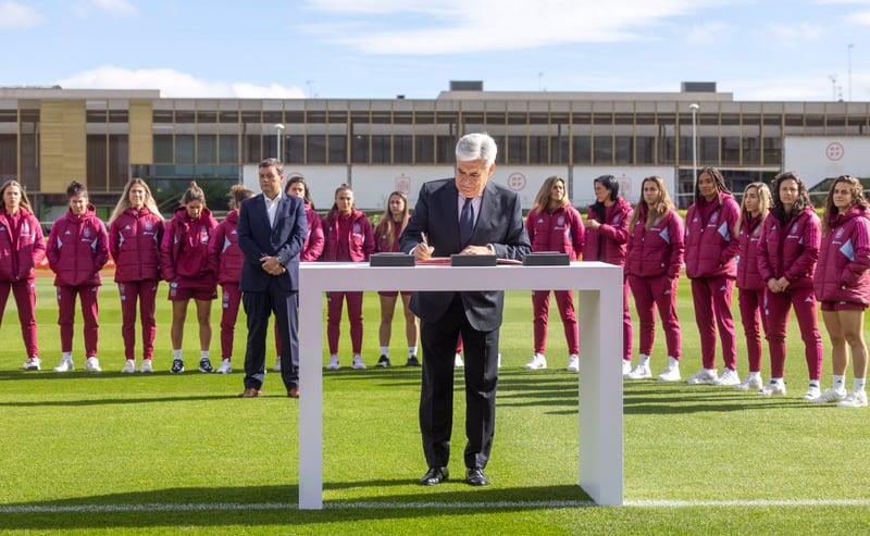Alexia Putellas, Irene Paredes y Olga Carmona han firmado este lunes un acuerdo histórico para el fútbol femenino. Las 3 internacionales, recién llegadas a la convocatoria para los próximos encuentros de la Selección Española de Fútbol, ha plasmado su firma junto a Pedro Rocha (presidente de la junta gestora de la Federación Española de Fútbol) y Víctor Francos (presidente del Consejo Superior de Deporte) en el documento que recoge los acuerdos alcanzados el pasado mes de septiembre en Oliva (Valencia) en referencia a las condiciones del fútbol femenino. Todas las jugadoras de la Roja estuvieron presentes, incluida Jenni Hermoso.