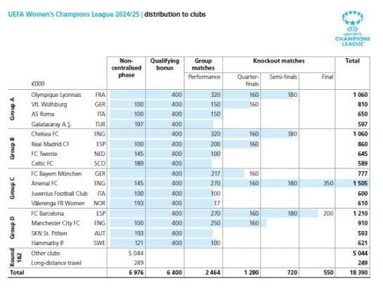 El único club que superó al Barcelona en ingresos fue el Arsenal, campeón del torneo, que alcanzó los 1.505.000 euros. Por detrás del conjunto azulgrana aparecen equipos históricos del fútbol femenino europeo como el Olympique de Lyon, con 1.060.000 euros, la misma cantidad que ingresó el Chelsea, dirigido por Sonia Bompastor.