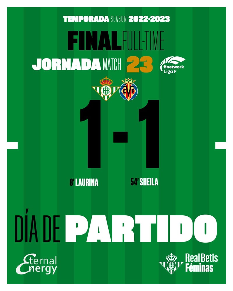 La tónica de la segunda mitad fue muy similar, sin que nadie generara claras ocasiones de gol hasta que apareció Sheila Guijarro, una vez más, para mandar el balón al fondo de la red y poner el empate en el luminoso. La delantera anotó su décimo gol del campeonato con una gran maniobra dentro del área, con un control con el pecho tras un pase preciso de Cristina Cubedo y un remate de semi volea que puso el 1-1 en el minuto 54. El equipo de Gerardo García seguía intentándolo, pero sin premio. En el minuto 63, un córner botado por Ángela Sosa permitió rematar a Carmen Álvarez plácidamente, y sólo el larguero evitó que su testarazo le diese ventaja al Real Betis. La réplica fue inmediata de las castellonenses, pero entre Thalmann y Paula Perea impidieron la remontada amarilla de Sara Monforte. Las béticas buscaron hasta el final el gol que les diese la victoria. Atres de cumplirse el tiempo reglamentario, un disparo de Asantewaa se topó con la cruceta del marco defendido por Carbonell, que sacó una mano salvadora en el 94 a disparo de Babajide.