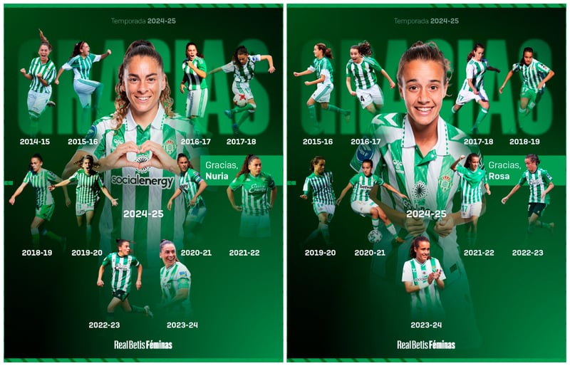El cruel descenso del Real Betis Féminas, colista de la Liga F 24/25, hacía anticipar una reconstucción total en el primer equipo femenino y la salida de la directora deportiva María Pry a los pocos días de terminar la temporada garantizaba una oleada de despedidas. Han sido y serán muchas este verano; pero pocas serán tan emotivas como las dos que se han juntado en las últimas 24 horas; ni más ni menos que dos capitanas. Este pasado lunes, el club anunciaba la retirada de Nuria Ligero, 'Nana', después de 11 temporadas en activo y este martes los medios oficiales daban a conocer también la marcha de Rosa Márquez, que lleva toda su vida de verdiblanca y ha militado en el primer equipo en las 13 últimas campañas.