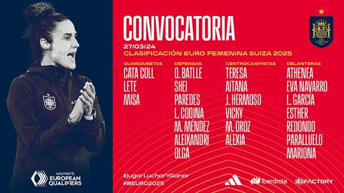 Siguen sin ser convocadas Patri Guijarro y Claudia Pina, campeonas del mundo, tampoco Mapi León, recién recuperada de una lesión, pero sí Alexia Putellas; también regresa Esther González